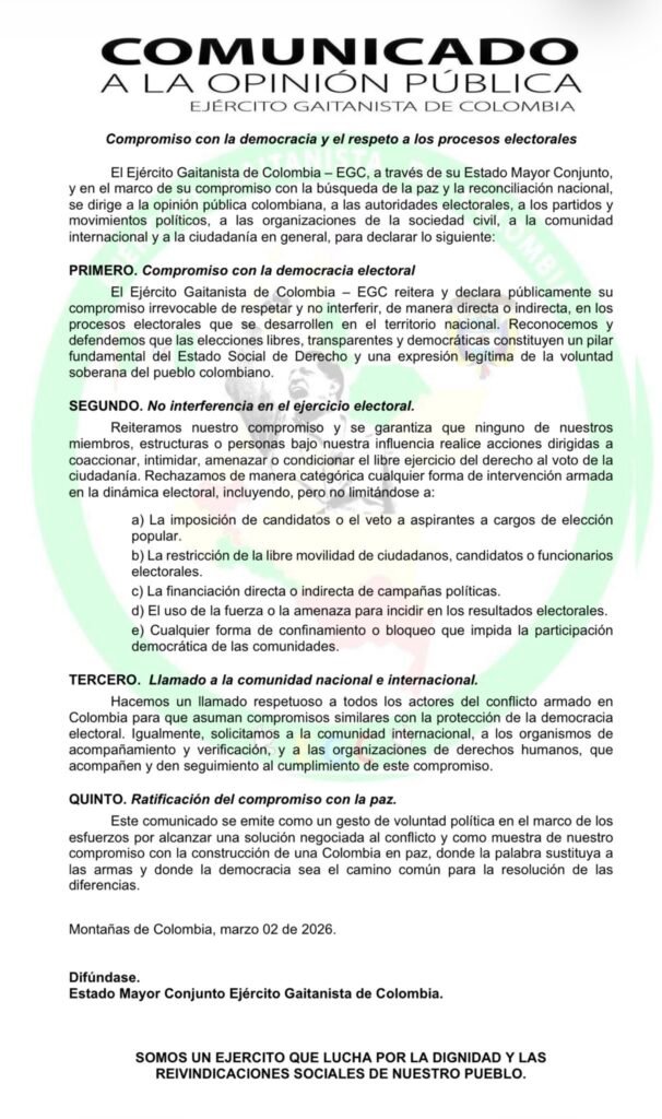 Finalmente, la organización enmarca este pronunciamiento como un “gesto de voluntad política” dentro de los esfuerzos por avanzar hacia una solución negociada al conflicto y reiteró su compromiso con la construcción de una Colombia en paz. El comunicado está fechado el 2 de marzo de 2026 y firmado por el Estado Mayor Conjunto del Ejército Gaitanista de Colombia.¿Cuál es la posición de otros grupos armados ilegales como las disidencias de las FARC, el ELN o estructuras como los llamados Comandos de Frontera frente al actual proceso electoral?