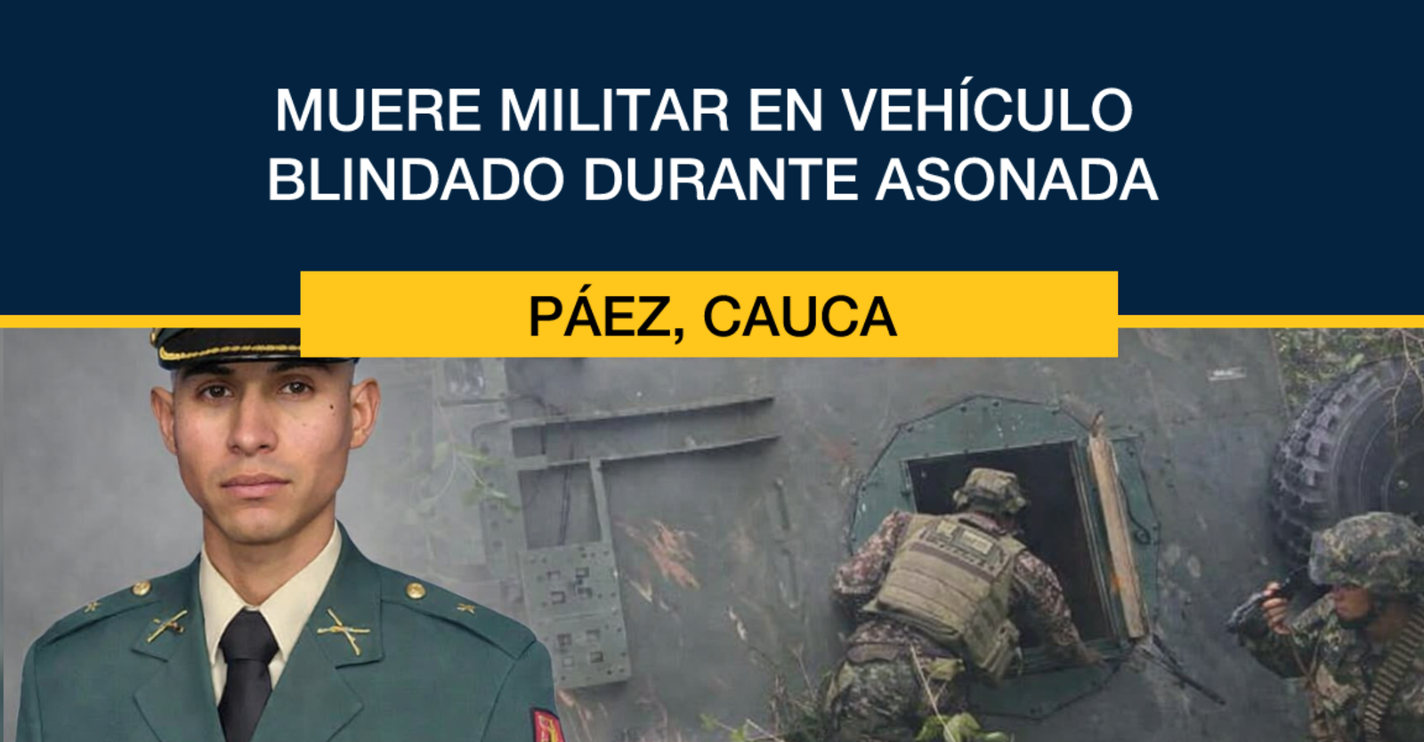 Un suboficial del Ejército murió y dos militares resultaron heridos luego de que un vehículo blindado cayera por un precipicio en zona rural del municipio de Páez, Cauca, en medio de disturbios provocados por habitantes del sector.